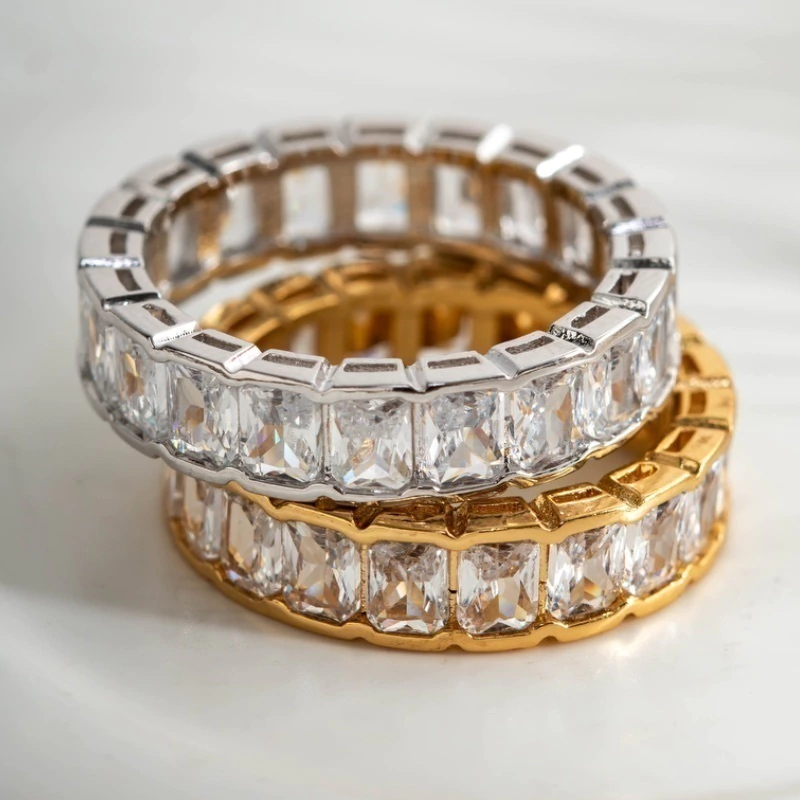 Anel Baguetado Dourado com zircônias e banho de ouro 18k.