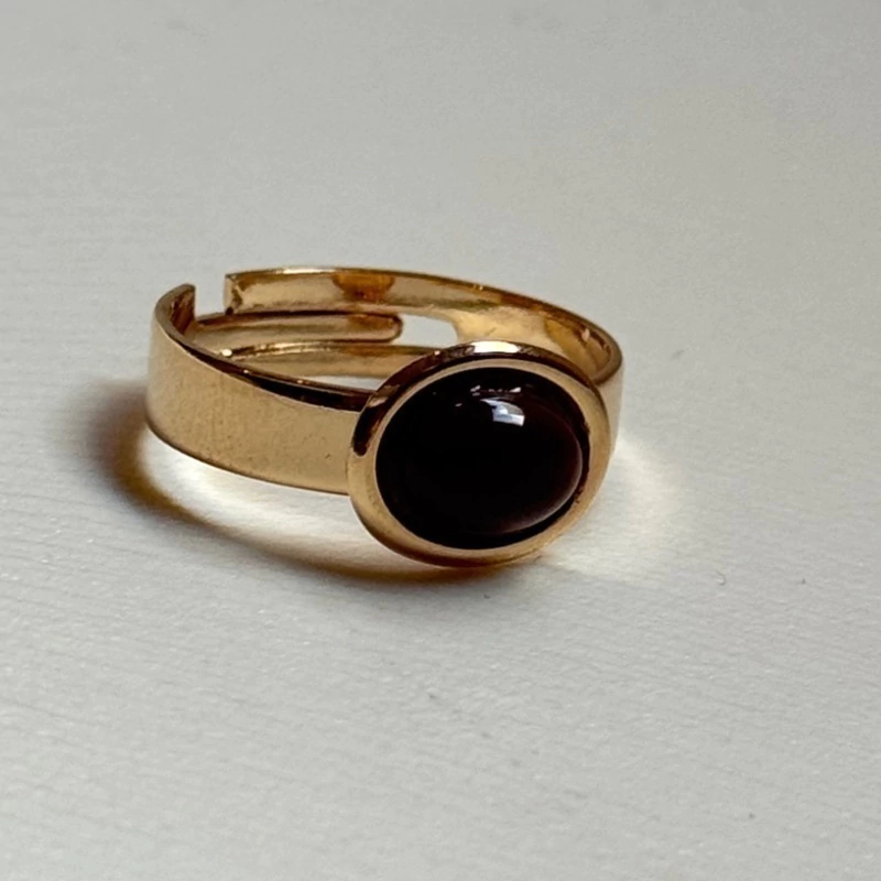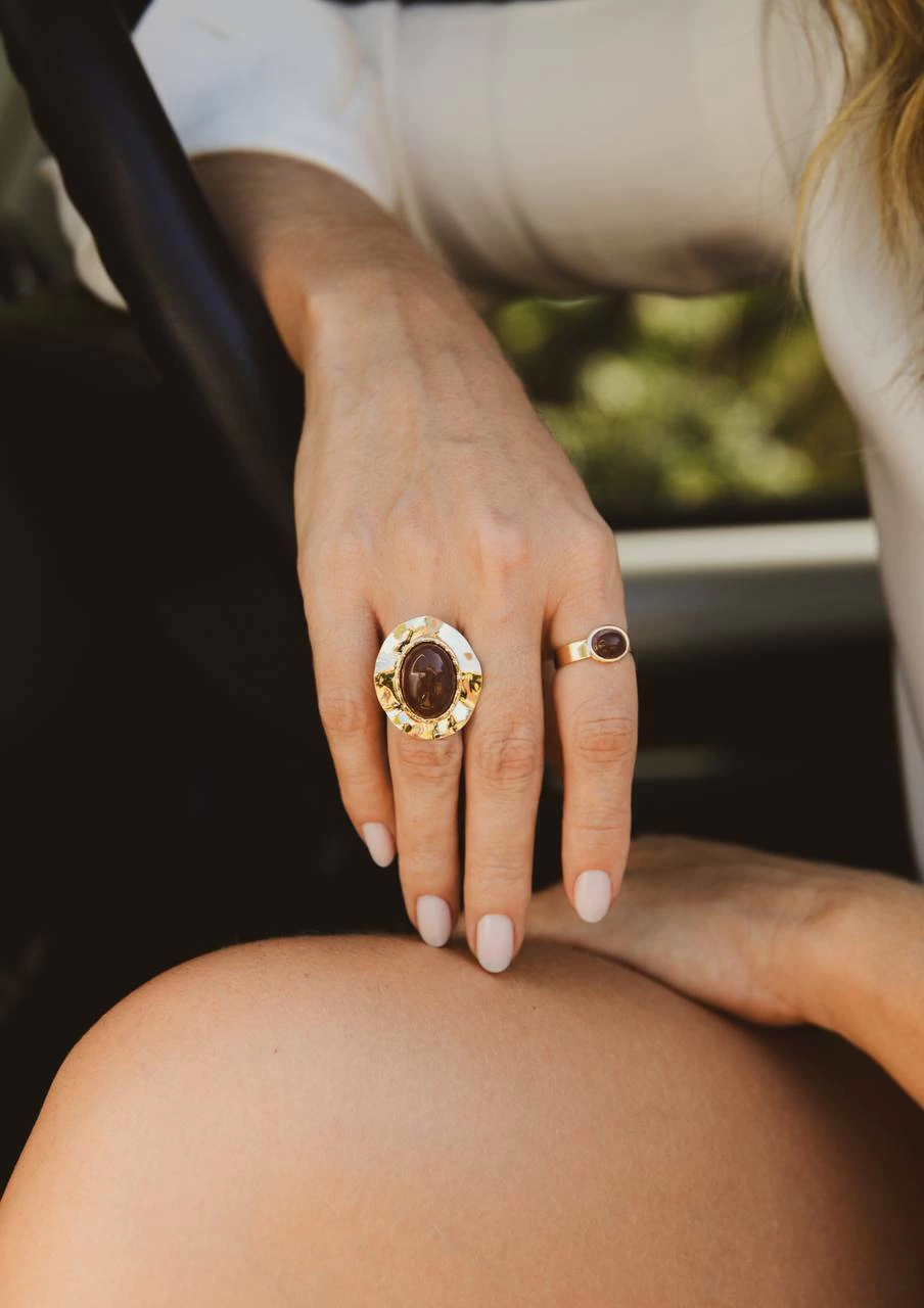 Anel ajustável com resina marrom e banho no ouro 18k.